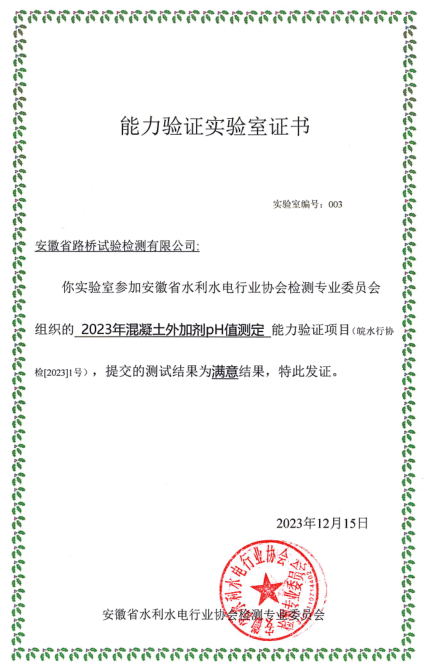 近日,建工檢測路橋試驗(yàn)檢測有限公司收到安徽省水利水電行業(yè)協(xié)會(huì)檢測專業(yè)委員會(huì)頒發(fā)的《能力驗(yàn)證實(shí)驗(yàn)室證書》,路橋檢測公司在“2023年混凝土外加劑pH值測定”能力驗(yàn)證結(jié)果為“滿意”,展現(xiàn)了路橋檢測公司試驗(yàn)檢測人員操作規(guī)范、試驗(yàn)數(shù)據(jù)真實(shí)準(zhǔn)確的技術(shù)水平和工作質(zhì)量。