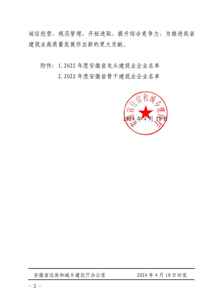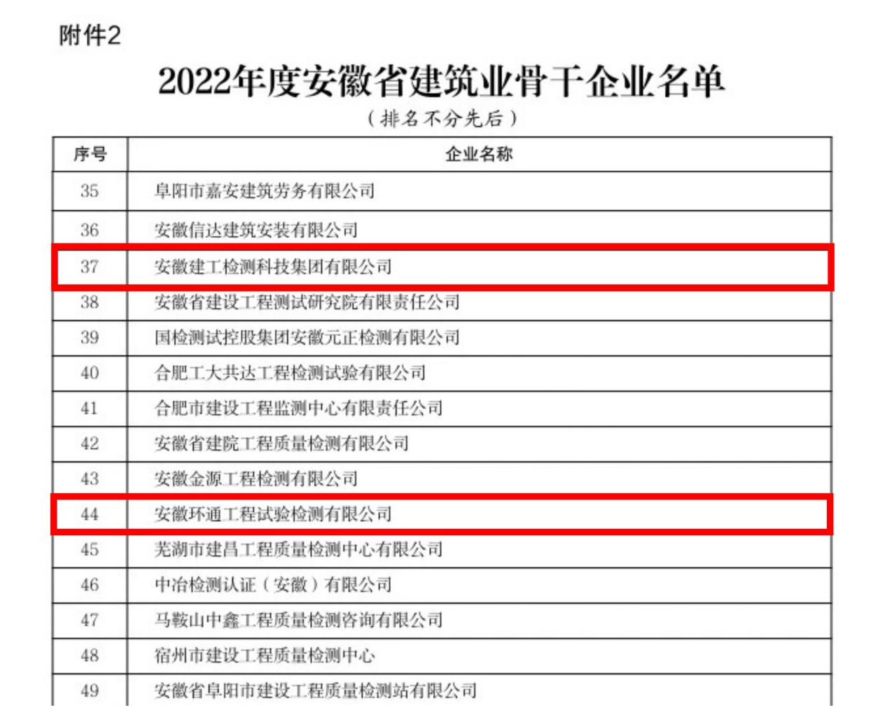 近日,安徽省住房和城鄉建設廳發布了“關于對2022年度安徽省建筑業龍頭骨干企業進行表揚的通報”,建工檢測及所屬子公司環通檢測榮登“骨干企業”榜單。