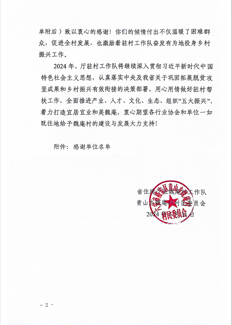 2024年,建工建測將以二十大精神為指引,深入貫徹落實黨中央、省委省政府關于鞏固脫貧攻堅和鄉村振興的工作要求,堅守初心使命、堅定使命擔當,積極履行國有企業社會責任,繼續加大幫扶力度,助力地方經濟發展和建設,為推進鄉村振興、助力魏庵村經濟社會發展工作繼續貢獻檢測力量。