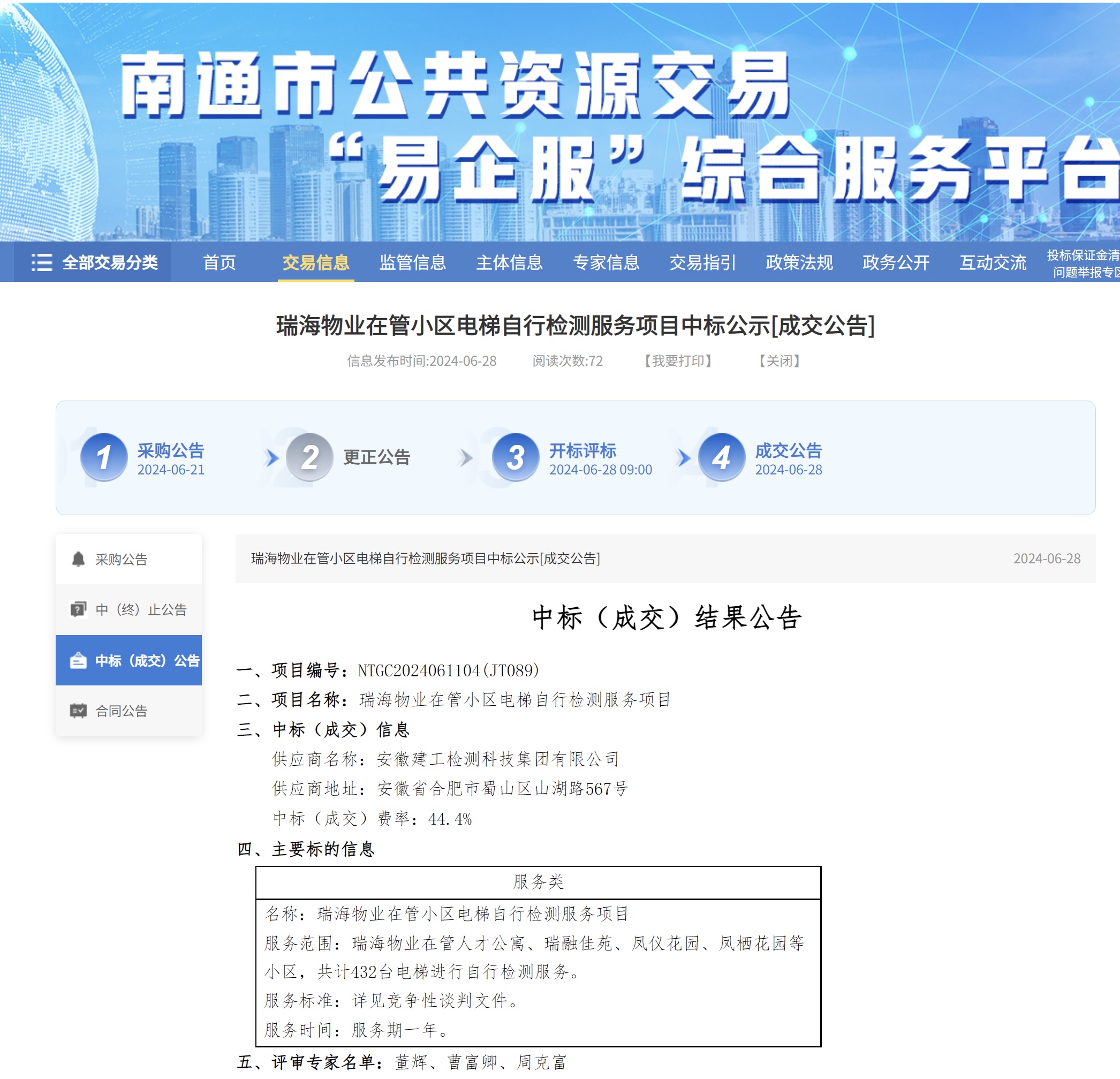 7月7日,建工檢測特檢中心成功中標江蘇南通“瑞海物業在管小區432臺(套)電梯自行檢測服務項目”,標志建工檢測特種設備電梯檢測領域實現了省外市場“零”的突破。