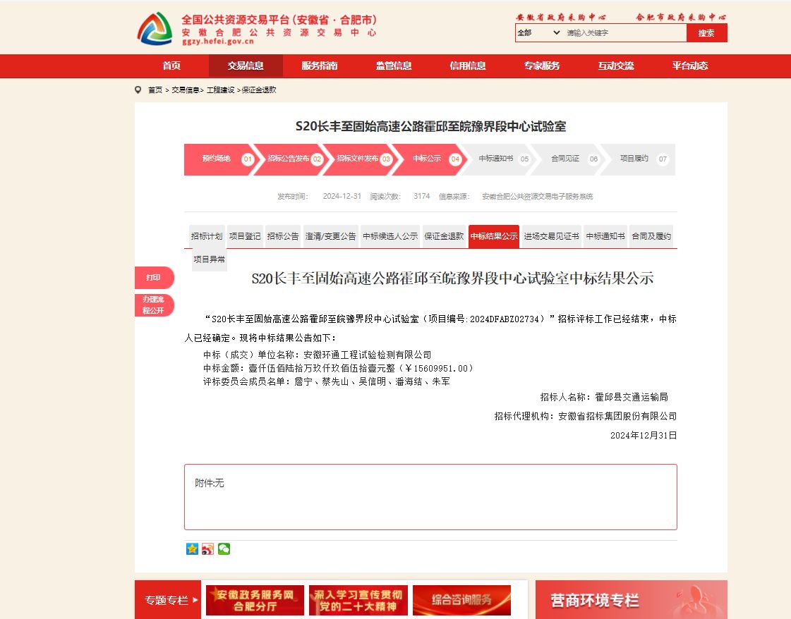 2024年12月31日,建工檢測所屬環通公司成功中標S20長豐至固始高速公路霍邱至皖豫界段中心試驗室項目,中標金額1560.9951萬元。