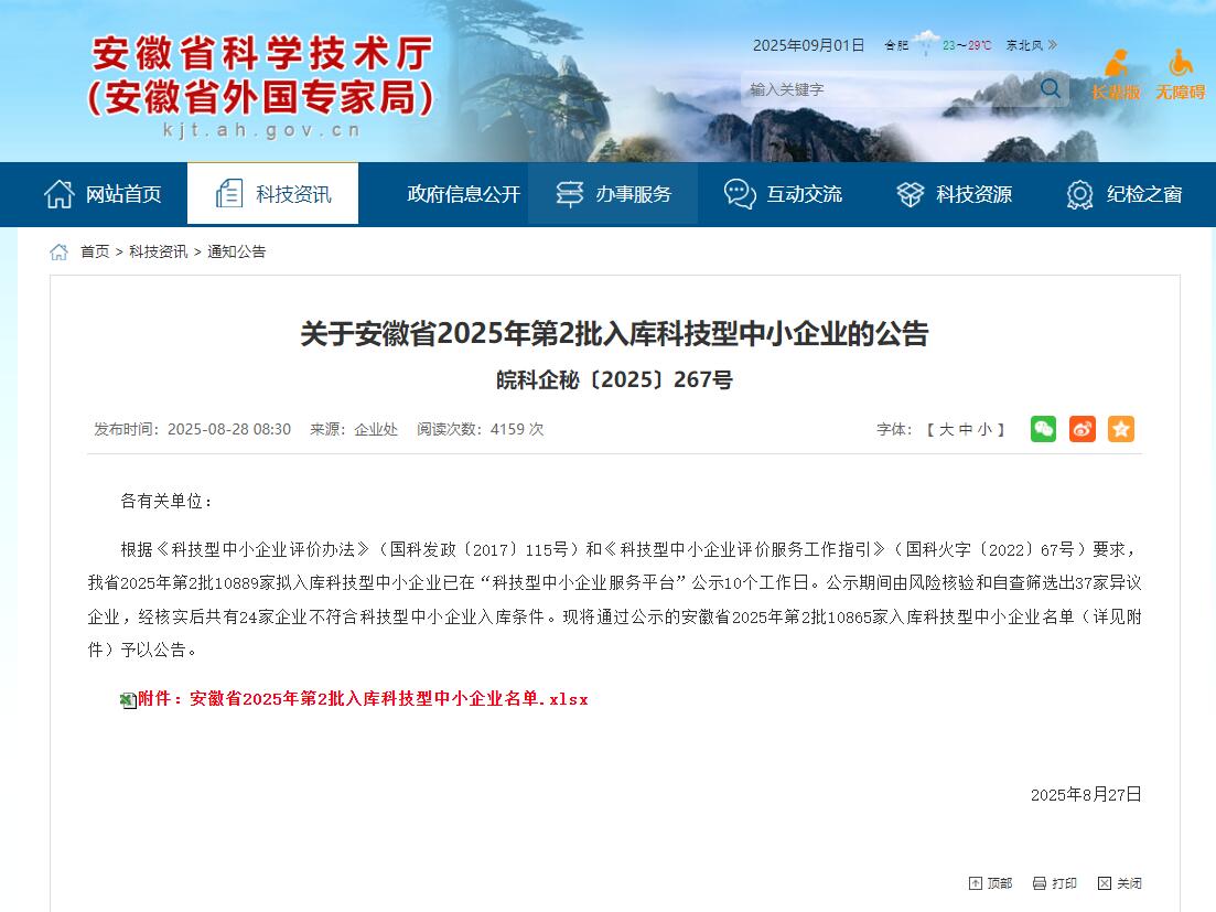 近日,安徽省科學技術廳正式公布2025年第2批入庫科技型中小企業名單,建工檢測公司所屬環通公司再度成功入選。