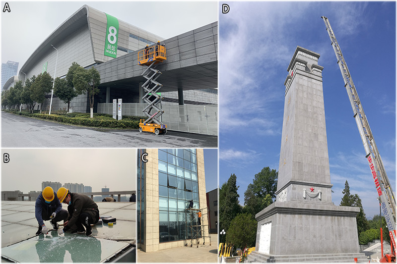圖 4 幕墻安全鑒定:(A) 濱湖會展中心;(B) 馬鞍山匯通采光頂;(C) 滁州晶田;(D) 金寨革命烈士紀念碑修繕工程