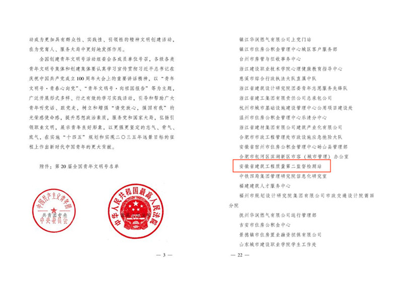 近日,第20屆全國青年文明號集體評選結果揭曉,安徽省建筑工程質量第二監督檢測站(簡稱安徽建科質檢二站)被命名為“第20屆全國青年文明號”榮譽稱號。