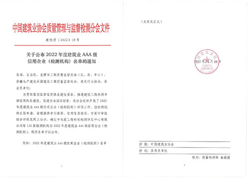 近日,從中國建筑業(yè)協(xié)會(huì)傳來喜訊,我站成功獲評(píng)“2022年度中國建筑業(yè)AAA級(jí)信用企業(yè)(檢測(cè)機(jī)構(gòu))”。