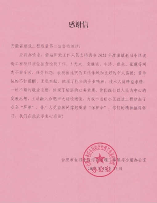 近日,應主管部門要求,道橋所派技術人員支持并完成了“合肥市2022年度城鎮(zhèn)老舊小區(qū)改造工程”項目質(zhì)量抽查工作。檢測工作獲參建各方廣泛認可,并收到主管部門發(fā)出的感謝信。